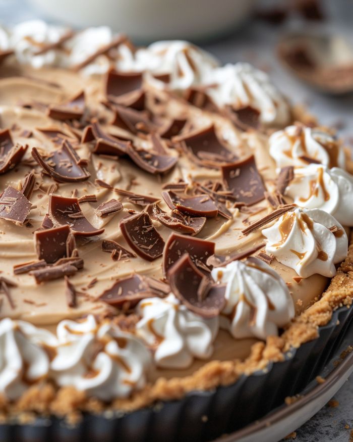 Dieser No-Bake-Erdnussbutterkuchen ist schon für sich genommen ein echter Genuss, aber wer Kontraste liebt, findet mit einem Klecks frisch geschlagener Sahne eine kühle, leichte Textur im Kontrast zur dichten Füllung. Eine starke Tasse Kaffee rundet die Fülle perfekt ab, oder für alle, die ihre Desserts lieber à la mode genießen, eine Kugel Vanilleeis. Für den besonderen Pfiff sorgt ein kleines Glas Dessertwein wie ein Sauternes oder ein Tawny Port – ein wahrhaft genussvolles Erlebnis.