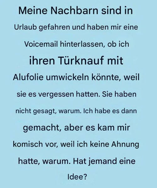 Als meine Nachbarn im Urlaub waren, hinterließen sie mir eine Voicemail-Nachricht mit der Frage, ob ich ihren Türgriff mit Alufolie umwickeln könnte.
