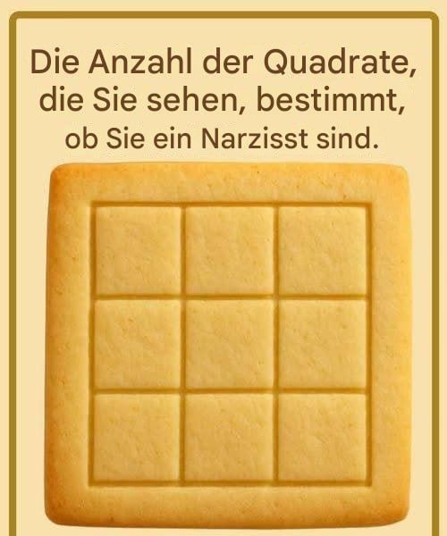 Auf den ersten Blick wirkt dieses einfache, keksartige Bild harmlos – nur ein in Teig geschnitztes Gitter. Doch die darüber stehende Frage: „Die Anzahl der Quadrate, die du siehst, verrät, ob du ein Narzisst bist“, lässt jeden innehalten. Es ist eine unterhaltsame psychologische Illusion, die online viral ging und Tausende von Diskussionen auslöste. Lasst uns erforschen, was dieses Rätsel wirklich über dein Denken, deine Beobachtungsgabe und – ja – darüber aussagt, ob sich unter deiner ruhigen Fassade vielleicht ein paar narzisstische Züge verbergen.