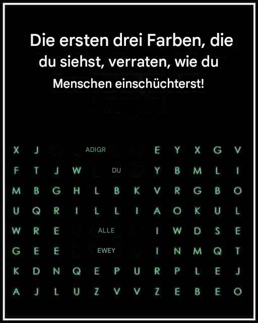 Betrachten Sie das Bild unten genau. Die ersten drei Farben, die Sie entdecken, sollen zeigen, wie Sie auf andere auf natürliche Weise einschüchternd wirken – sei es durch Selbstbewusstsein, Intelligenz, Kreativität oder einfach durch Ihre Präsenz.