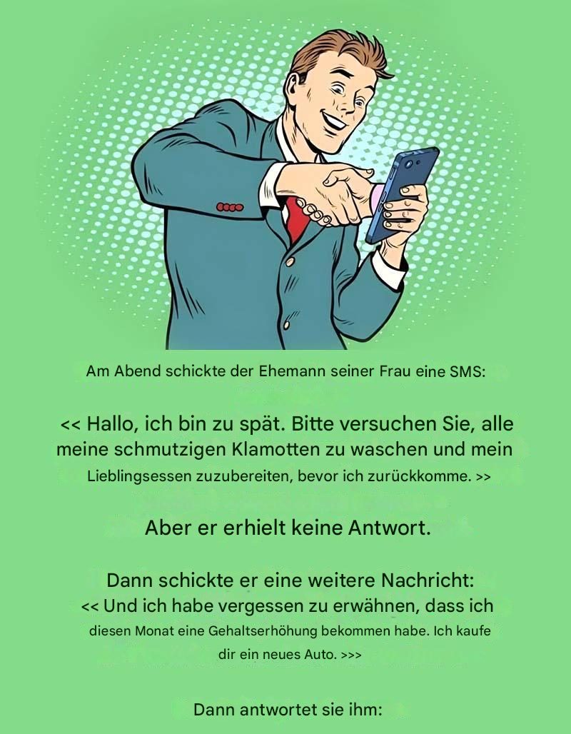 Stellen Sie sich folgende Szene vor: Ein müder Ehemann, der zu spät nach Hause kommt, beschließt, seiner Frau eine Nachricht zu schicken, in der er um kleine Bemerkungen bittet. « Hallo, ich komme zu spät, bitte wasche meine schmutzigen Klamotten und bereite dein Lieblingsgericht zu. » Einfach und eindeutig, oder? Das Fehlen einer Antwort weckt jedoch seine Neugier.