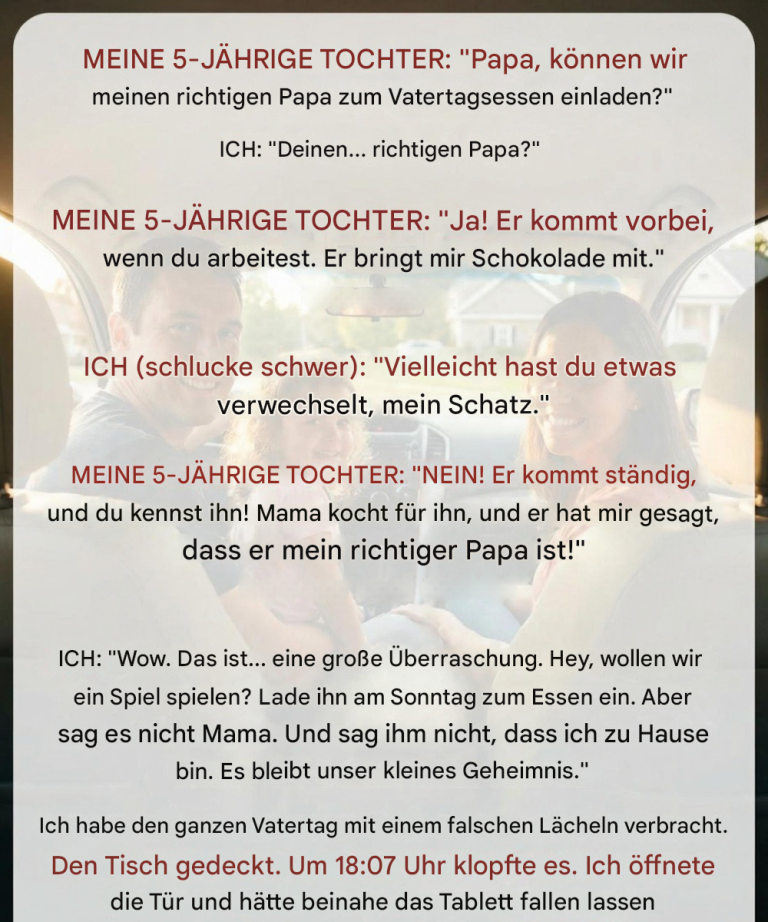 Es klang wie die Art von seltsames, unschuldiger Sache, die Kinder manchmal sagen, ohne das Gewicht ihrer Worte zu verstehen. Wir fuhren gerade von der Kita nach Hause, als sie plötzlich fragte: "Papa, können wir meinen echten Vater zum Abendessen am Vatertag einladen?"