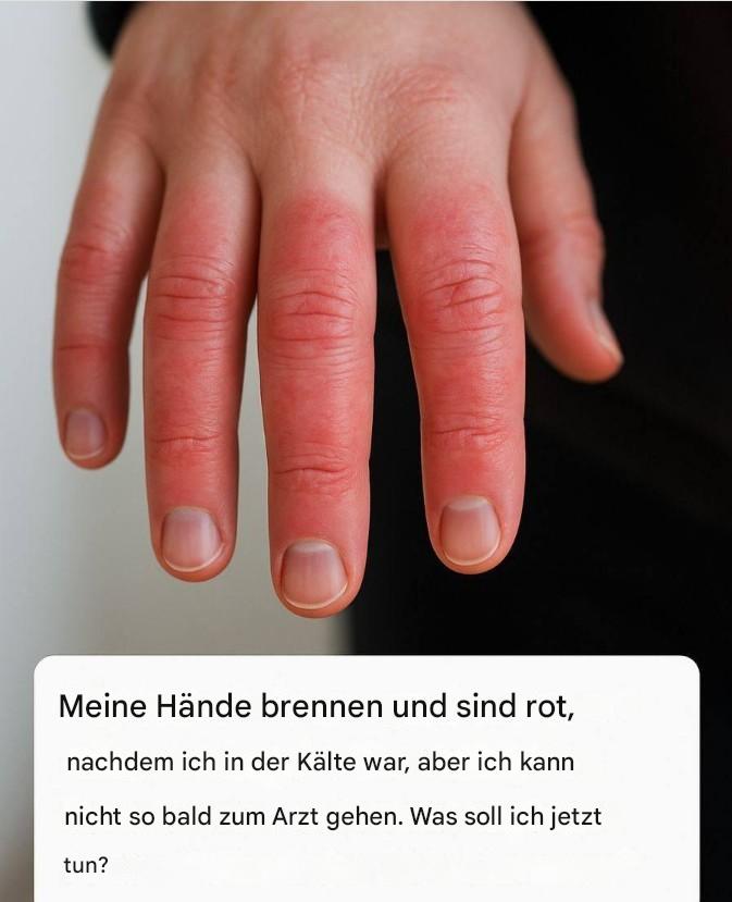 Es tut mir leid, dass Sie diese Beschwerden haben; das klingt sehr unangenehm und besorgniserregend. Ihre Beschreibung (brennende und rote Hände nach Kältekontakt) könnte auf das Raynaud-Syndrom hindeuten. Dabei handelt es sich um eine häufige Erkrankung, bei der die Blutgefäße in den Fingern (und manchmal auch Zehen) übermäßig auf Kälte oder Stress reagieren. Dies führt zu einer verminderten Durchblutung, gefolgt von einer reaktiven „Rebound“-Phase, die Brennen, Pochen und Rötungen verursacht, wenn das Blut wieder zurückfließt.