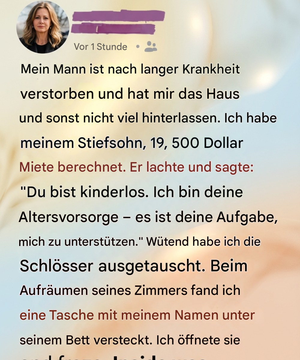 Die Zimmer waren unverändert, doch alles klang hohl, als hielten die Wände selbst den Atem an. Monatelang vor seinem Tod hatten uns Krankenhausflure, Laborergebnisse und vorsichtiger Optimismus geprägt. Als all das vorbei war, fühlte sich die darauf folgende Stille schwerer an als die Angst, die uns zuvor begleitet hatte. Neben der Trauer kamen praktische Sorgen – offene Arztrechnungen, Hypothekenzahlungen und die erdrückende Realität, alles allein bewältigen zu müssen. Mein neunzehnjähriger Stiefsohn Leo lebte noch bei mir. Wir trauerten beide, kämpften aber auch auf unterschiedliche Weise damit, uns eine Zukunft vorzustellen, auf die keiner von uns vorbereitet war.