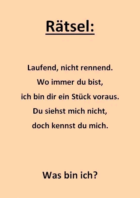 „Laufend, nicht rennend. Wo immer du bist, ich bin dir ein Stück voraus.“ Klingt wie ein Gedicht – ist aber ein cleveres Rätsel! Was ist gemeint? Du kannst es nicht sehen, aber du kennst es ganz genau… 👇👇👇 Erfahre auf Seite 2, was die Antwort ist 👇👇👇 |