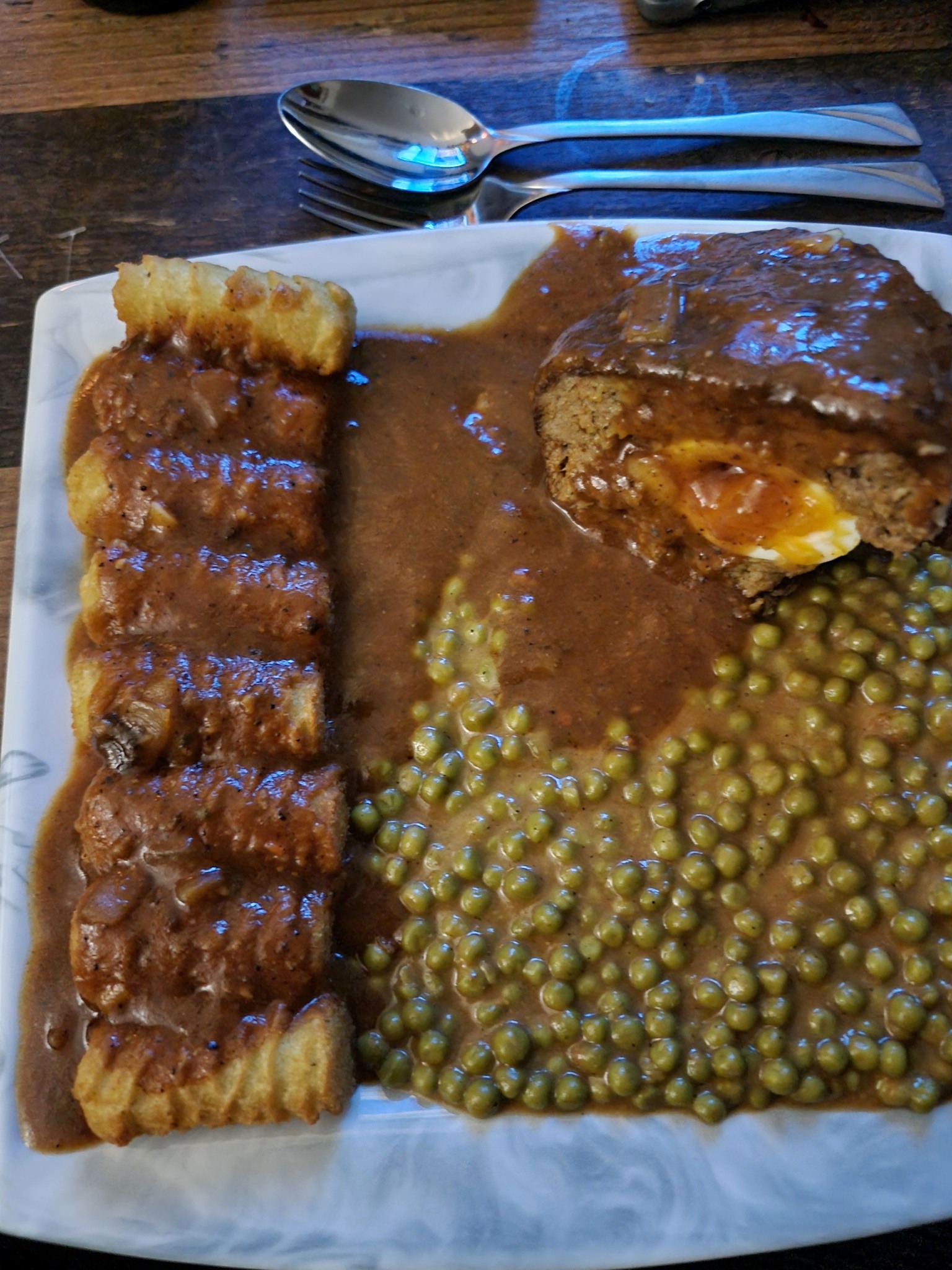 🍽️ Hackbraten mit Ei, Kroketten & Erbsen – Rezept