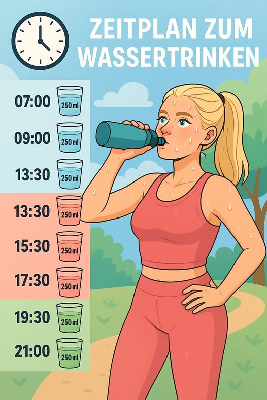 07:00 – Ein Glas Wasser (ca. 250 ml) weckt Stoffwechsel und Kreislauf auf. ![]()