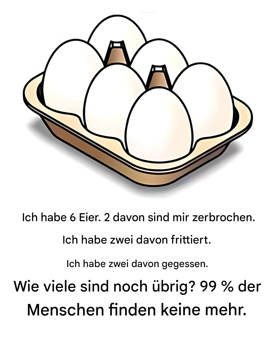 „Ich habe 6 Eier. Ich habe 2 aufgeschlagen. Ich habe 2 gebraten. Ich habe 2 gegessen. Wie viele Eier habe ich noch übrig?“