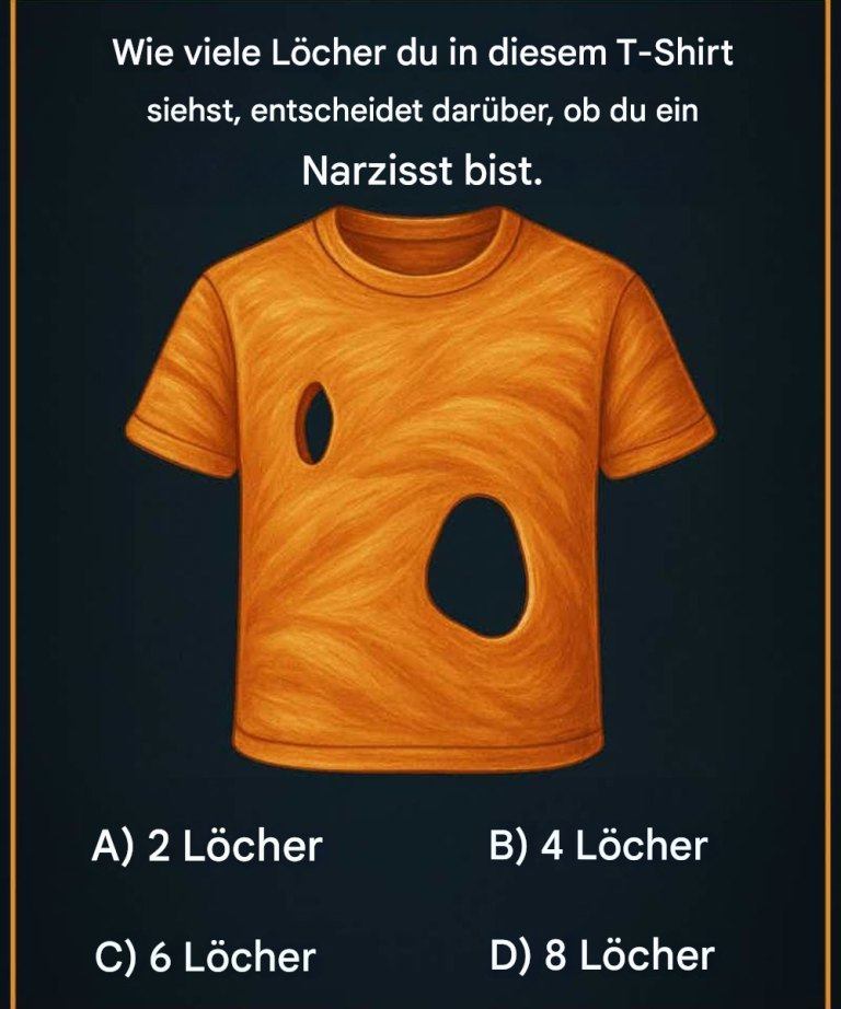 Du entdeckst ein leuchtend orangefarbenes T-Shirt mit zwei tiefen Rissen vorne. Unter dem Bild findest du vier Auswahlmöglichkeiten – 2, 4, 6 oder 8 Löcher – und eine freche Überschrift: „Wie viele Löcher du in diesem T-Shirt siehst, verrät, ob du ein Narzisst bist.“ Bevor du dich selbst verurteilst, betrachte dies als eine Art lockeres, teilbares Denkspiel, das mehr über deine Denkweise aussagt als über deine psychische Gesundheit.