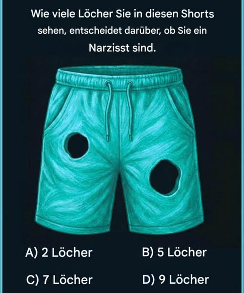 Auf den ersten Blick wirkt dieses virale Bild wie nichts weiter als eine zerrissene Shorts. Doch sobald man die Überschrift liest – „Wie viele Löcher du in dieser Shorts siehst, verrät, ob du ein Narzisst bist“ – schaltet das Gehirn augenblicklich vom passiven Scrollen in den analytischen Modus. Und genau deshalb hat dieses optische Rätsel die sozialen Medien im Sturm erobert: Es fordert unsere Wahrnehmung heraus und neckt gleichzeitig unser Ego.